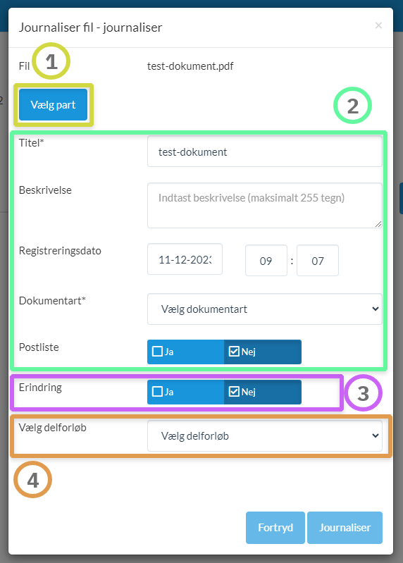 Evt. tilknytte dokumentet til et delforløb. I denne dropdown kan du enten vælge at oprette et nyt delforløb eller anvende et eksisterende.