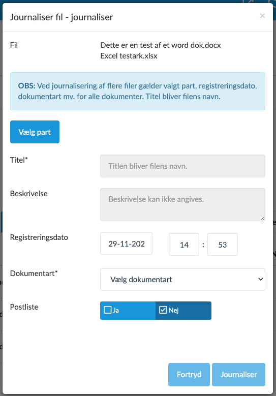 Der vælges på samme måde part, registreringsdato, dokumentart og postliste for alle valgte dokumenter