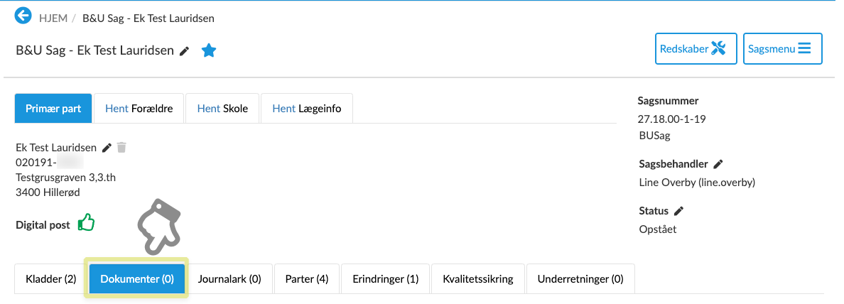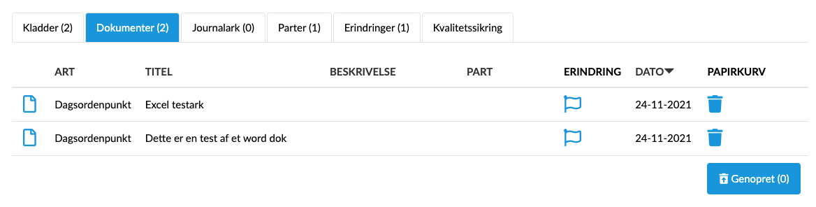 På dokumentoversigten ses dokumentets Art, Titel, Beskrivelse, Partens navn, evt. Erindring og Dato.