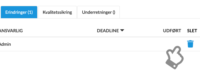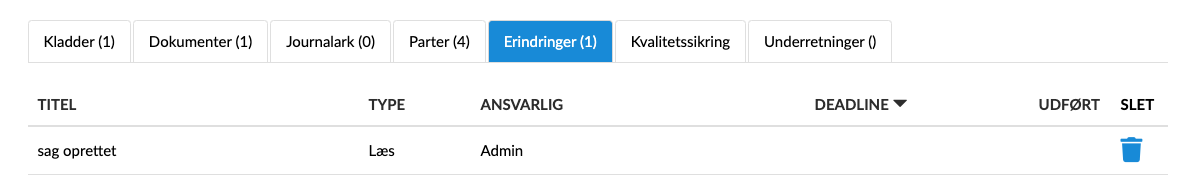 På oversigten ses Titel, Type, Ansvarlig, Deadline og Udført.