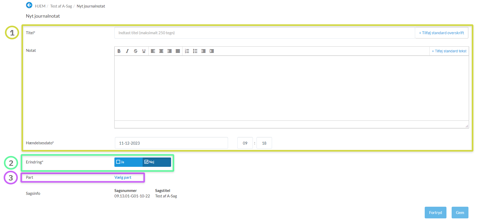 Tilføje en titel, skrive notatet og evt. sætte hændelsesdatoen.
