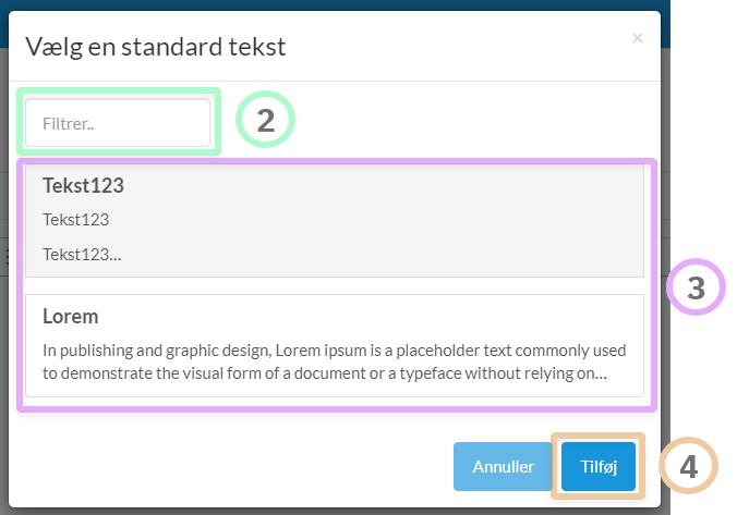 Der er mulighed for at filtrere i standardteksterne i det øverst felt.