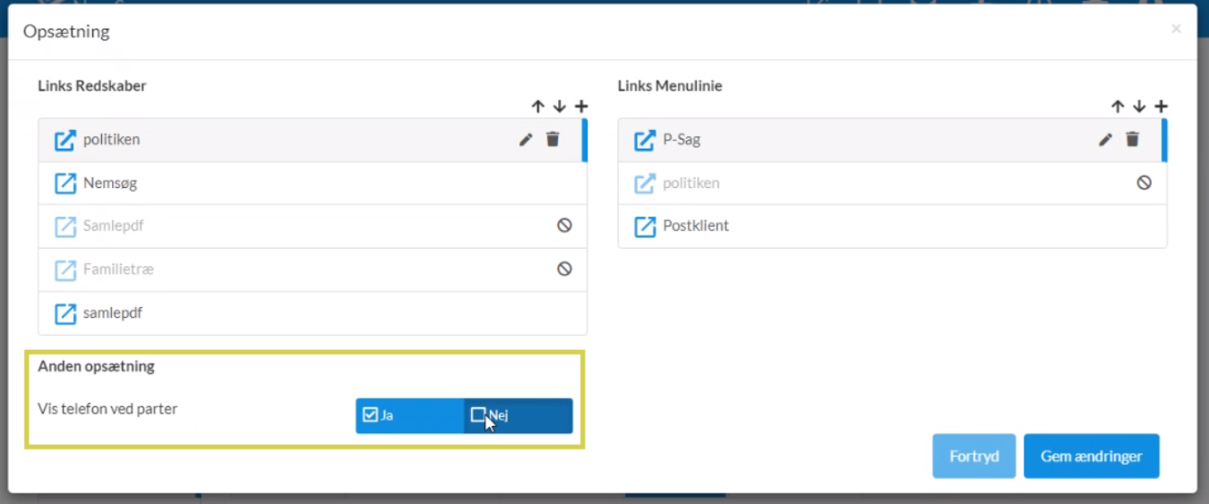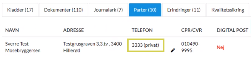 Der er mulighed for at vise eller skjule telefonnummer i listen over parter på en sag.
