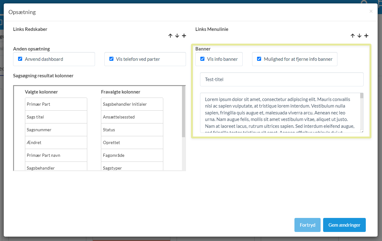 Herunder er det muligt, at bestemme hvilke felter der skal vises i tabellen ved søgning på sager, samt ved visning af kladder, dokumenter og journalnotater på en sag.