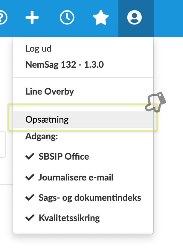 For at tilgå den opsætning, der findes i webklienten skal du klikke på opsætning under profil-ikonet i menu-linjen, hvis din rolle giver dig rettighed til det.