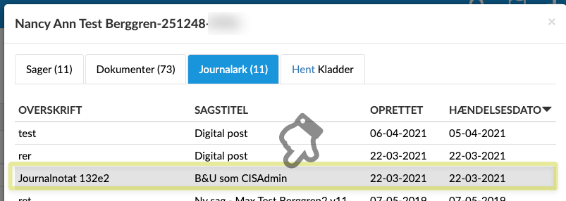 Fanen Journalark indeholder alle journalark fra sager, hvorpå den valgte er part.