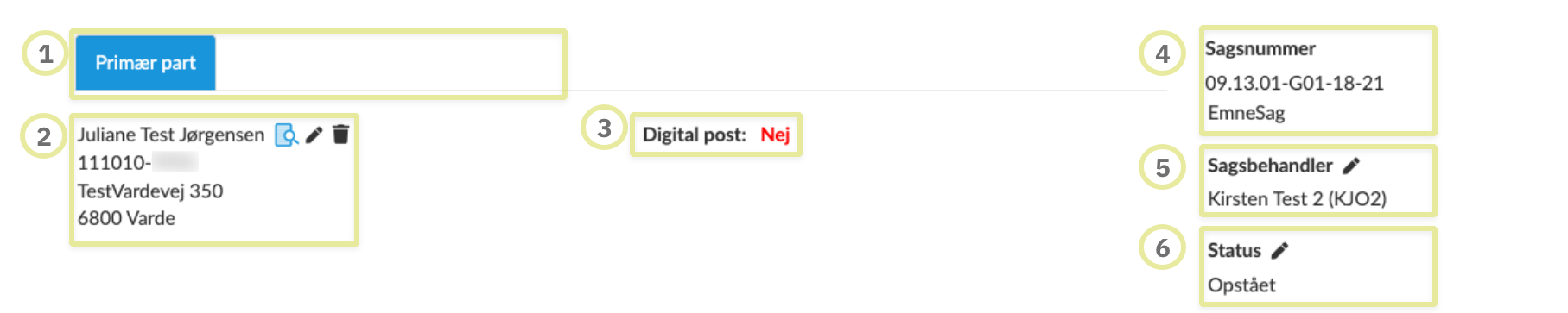 Selve sagshovedet indeholder oplysninger vedrørende den primær part