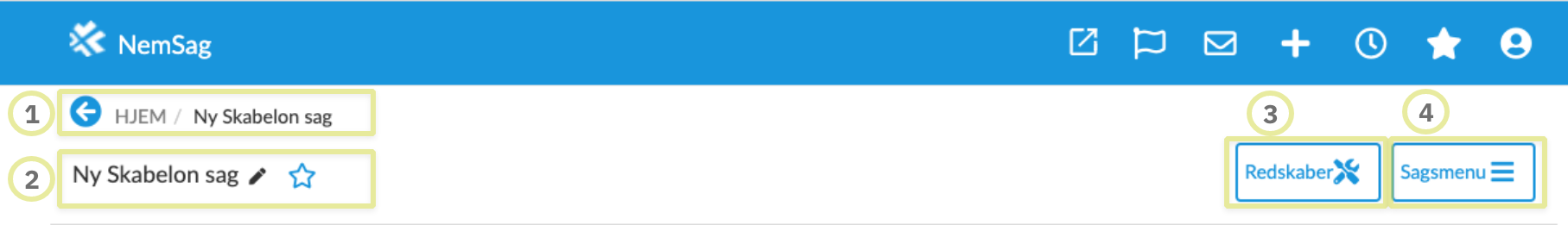 Sagens titel findes her, samt muligheden for at redigere den ved at klikke på blyanten. Desuden kan sagen markeres som favorit, ved at klikke på stjernen så den bliver udfyldt. Den kan på samme måde fjernes som favorit igen, ved at klikke på stjernen. Nogle sager kan have nogle fastbestemte titler, som man skal vælge imellem. I sådan et tilfælde vil der ved redigering af titlen blive vist en dropdown med mulige titler.