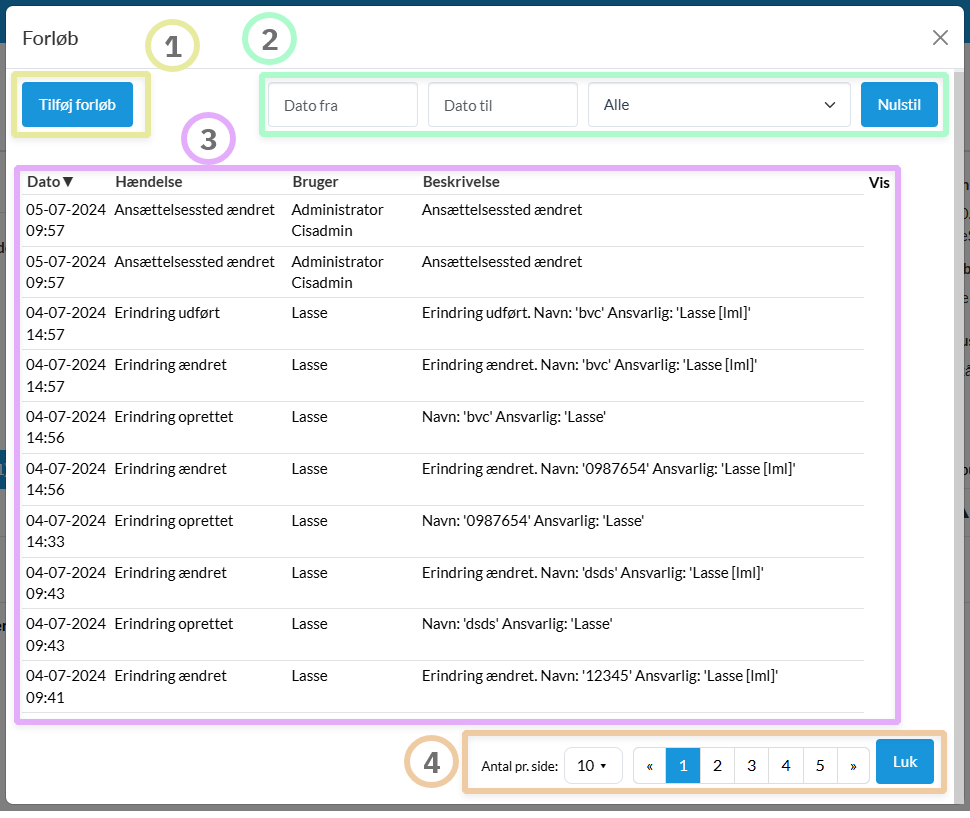 Sortering/filtrering: Hændelserne kan sorteres/filtreres efter kolonnerne dato og hændelsestype.