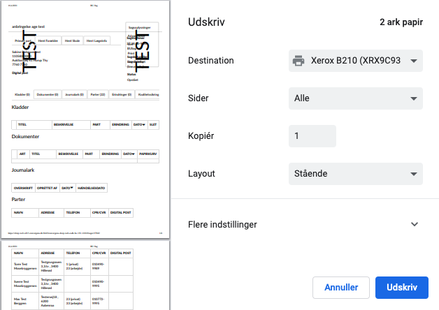 Print er en standardfunktion, der gør det muligt at printe en oversigt over sagen og dens indhold