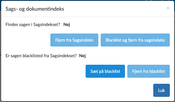 Klikker du på knappen Blacklist og fjern fra Sagsindeks, vil sagen med det samme blive fjernet fra Sags- og Dokumentindekset og sagens UUID registreres i en blacklist på SBSIP. Sagen vil herefter - ved sags-opdateringer - ikke blive skrevet til beskedbasen og videre til Sags- og Dokumentindekset.
