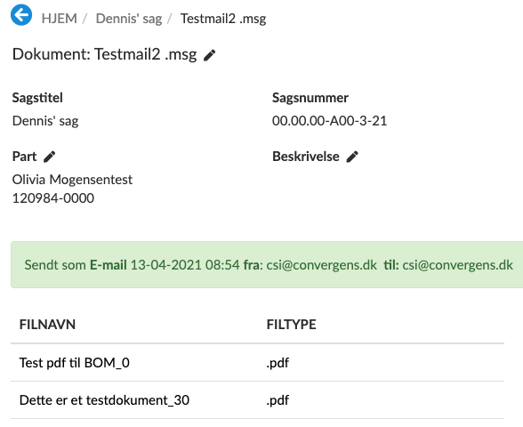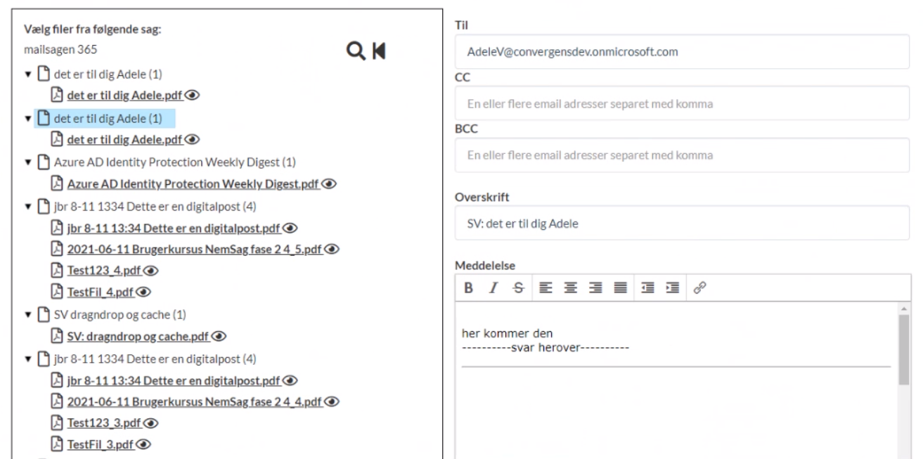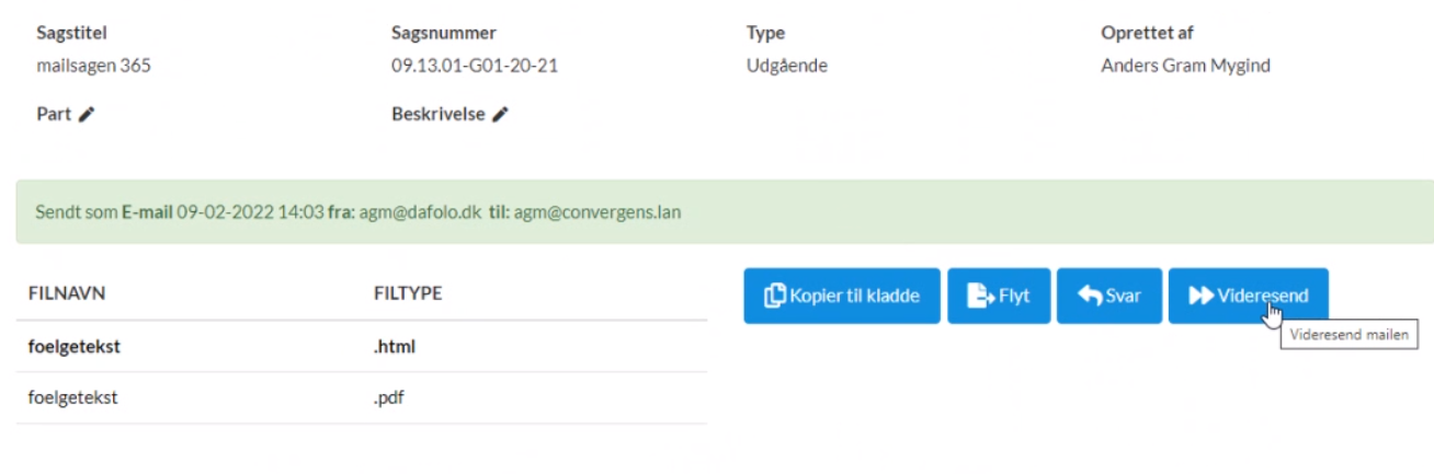 Mailen journaliseres ind som et dokument på sagen, når du har sendt den