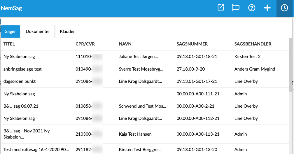 På fanebladet i toppen kan du vælge om du vil se Sager, Dokumenter eller Kladder