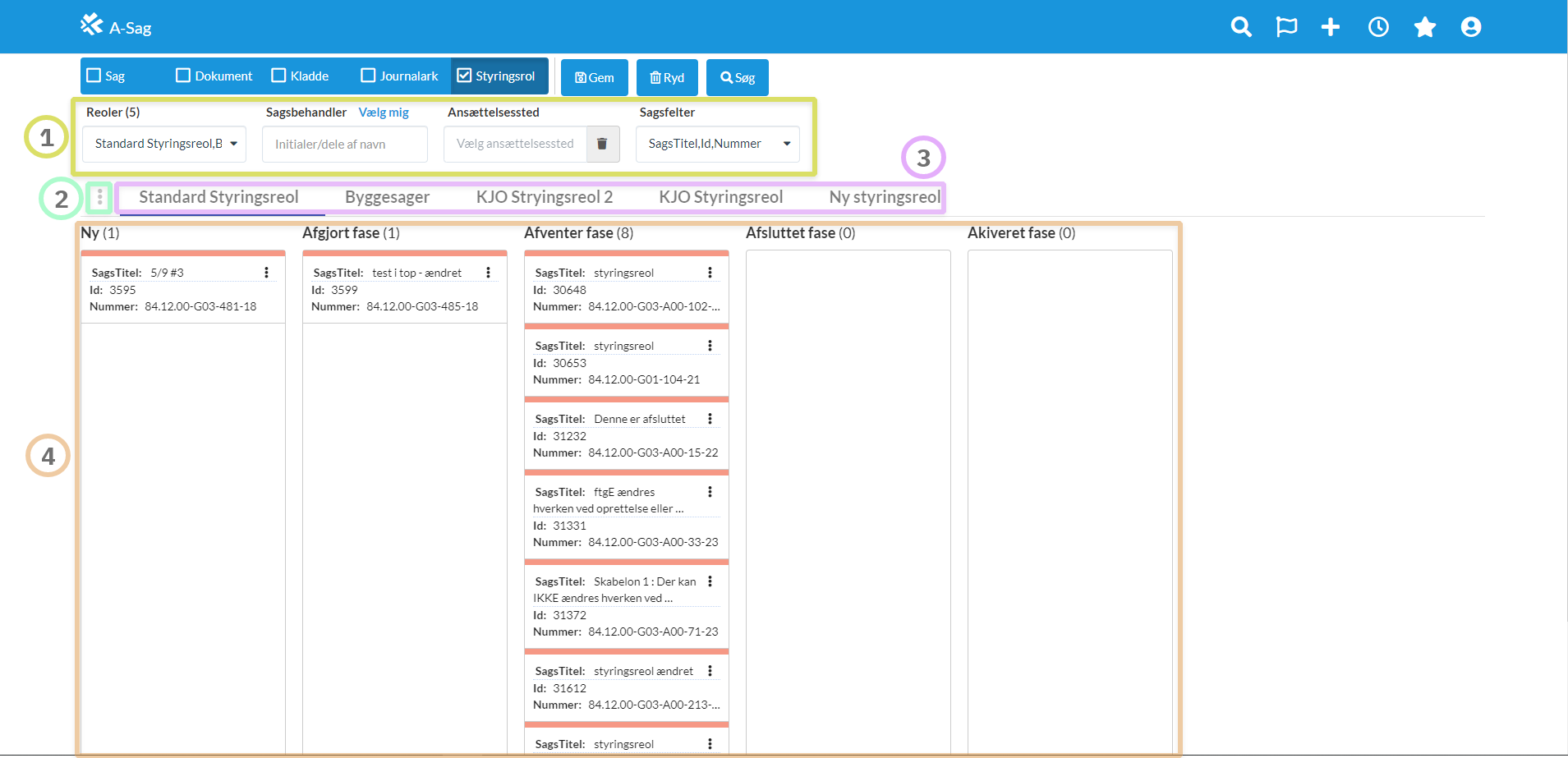 Styringsreol: Her vises sager på en styringsreol, hvor hylder/faser opdelt i kolonner. De enkelte sager vil være markerede med farverne grøn (fornyligt tilføjet til hylde), gul (dealine nærmer sig) og rød (deadline nået). De valge sagsfelter vises for hvert element De enkelte sager har i øverste højre hjørne en