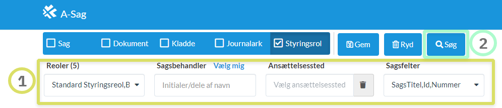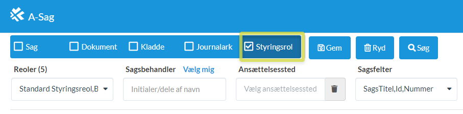 Søgekriterier: Styringsreoler kan fremsøges ved hjælp af felterne Reoler, Sagsbehandler og Ansættelsessted. Derudover kan der vælges hvilke sagsfelter skal være synlige for de enkelte sager i styringsreolen.