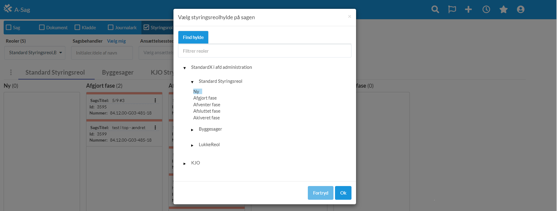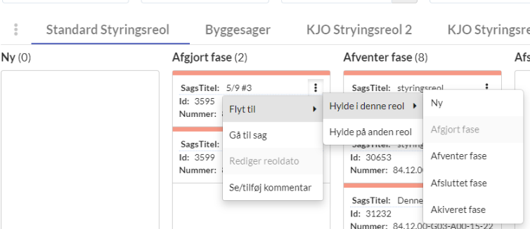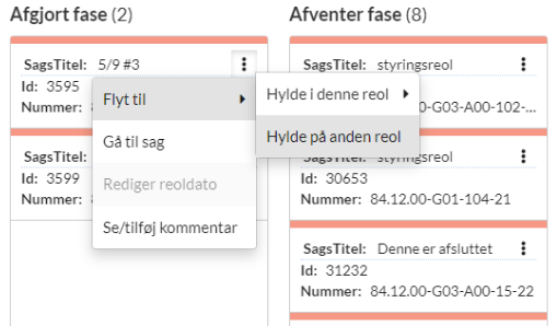 En sag kan flyttes til en anden hylde i den aktuelle reol ved at klikke, holde og flytte den med musen, Flytning kan også ske ved at klikke på menu-ikonet på den enkelte sag. Det er også muligt, at klikke på menu-ikonet (tre prikker), og i dropdown-menuen vælge “Flyt til” og derefter den ønskede hylde.