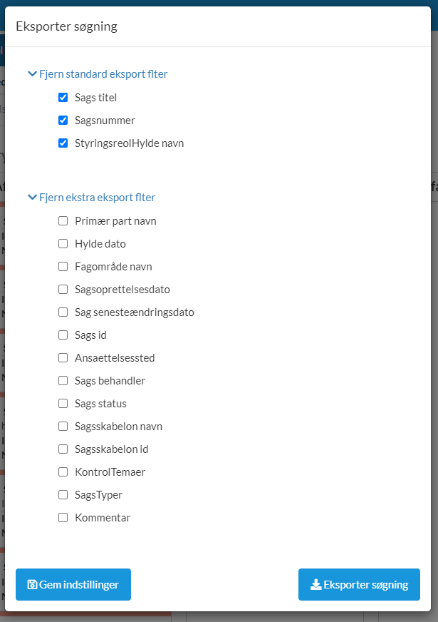 Herefter vises en dialog, hvor der kan vælges de felter, som Excel-filen skal indeholde. Vælg de ønskede felter og klik på “Eksporter søgning.”