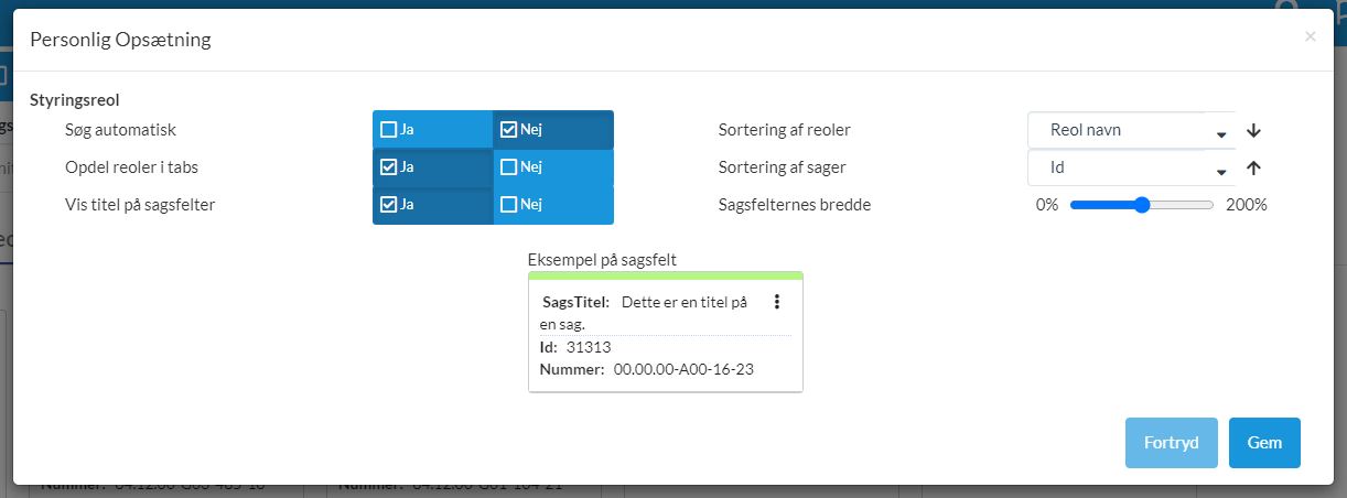Vis titel på sagsfelter: Ved fravalg af denne indstilling, vises blot værdierne for sagsfelterne. Dette kan give mere plads i brugergrænsefladen.