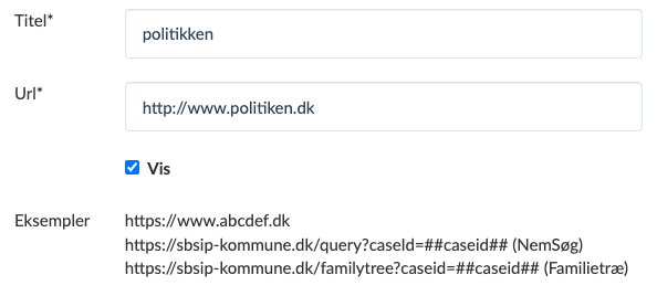 Først kopierer du tekst bidden fra det relevante eksempel. I dette tilfælde er det teksten fra NemSøg, som kopieres og indsættes i feltet Url.