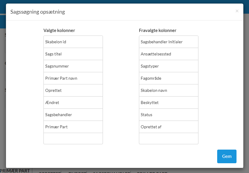 Derefter vises en dialog, hvor man kan tilføje og fjerne kolonner fra visningen ved at trække elementer mellem valgte kolonner og fravalgte kolonner: