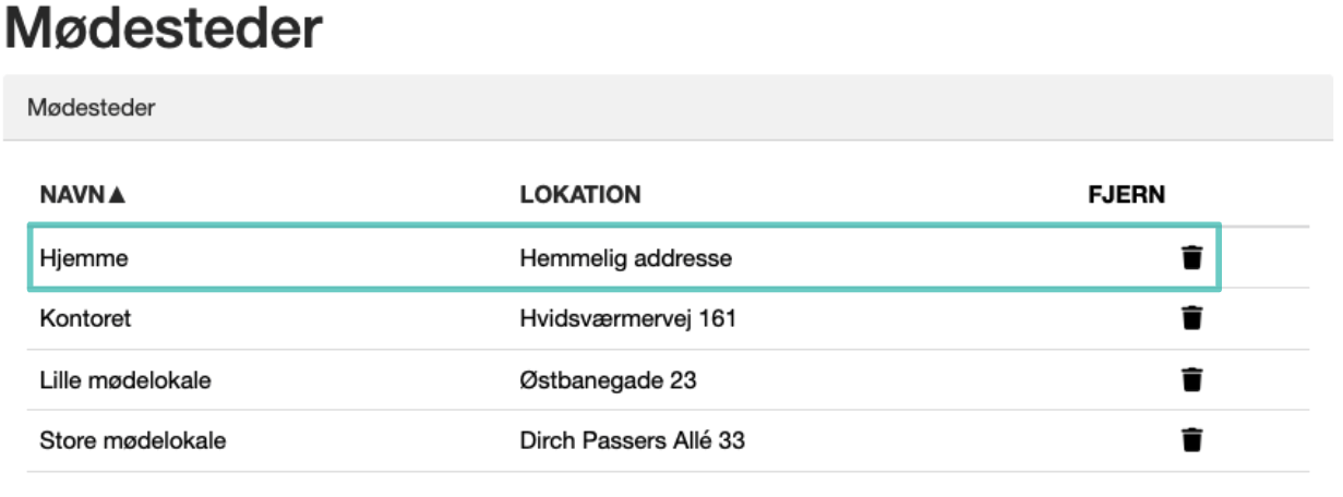 Klik på skraldespandsikonet for at fjerne et mødested.