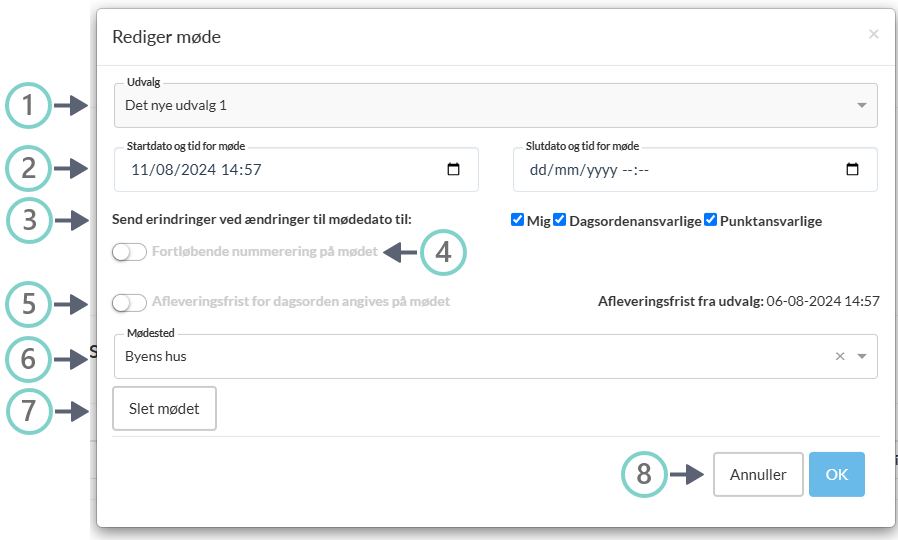 Rediger start- og sluttidspunkt for mødet. Der vil være mulighed for at sende erindringer i forbindelse med eventuelle ændringer.