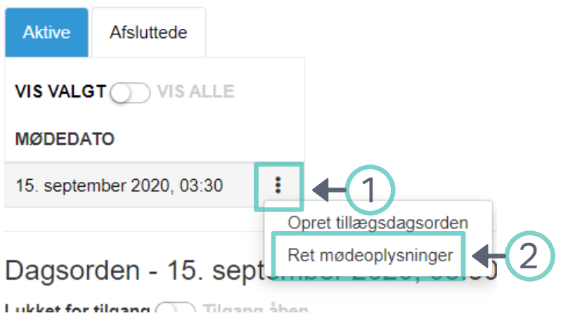 Klik på de 3 prikker ved siden af datoen for mødet.