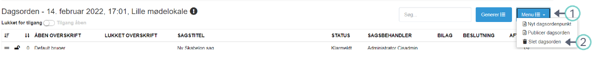 Klik på Menu ikonet ud fra den dagsorden/tillægsdagsorden, der ønskes slettet.