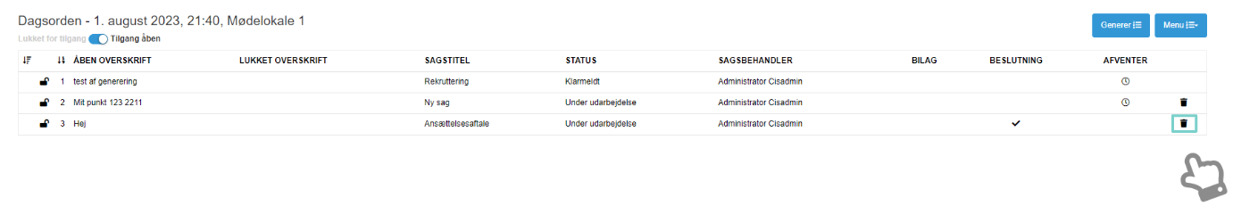 Klik på den dagsorden, der indeholder det punkt, du ønsker at slette.